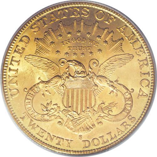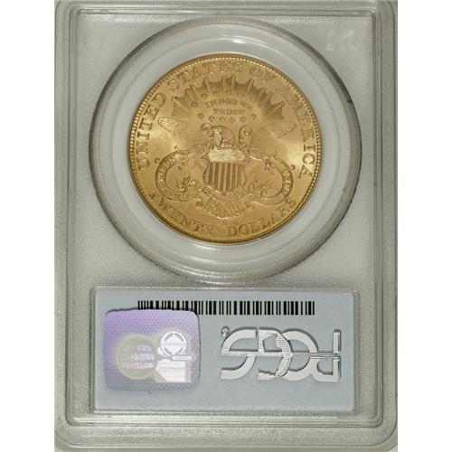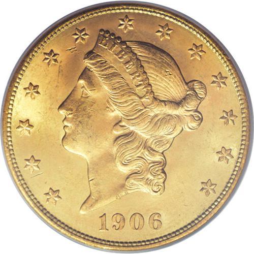 <B>1906-S $20 MS64 PCGS.</B></I> The 1906-S, with a mintage exceeding two million pieces, is relatively available through Mint State 63. MS64 coins, on the other hand, become scarce, and PCGS and NGC combined have certified fewer than 10 Gems. Apricot-gold surfaces on the current near-Gem display hints of lime-green, along with pleasing luster. A sharp strike has given sharp definition to the design features, including the star centers and Liberty's hair strands. Some minute handling marks preclude a higher grade.<BR><BR><b>Shipping:</b> Coins & Currency (<a target="_blank" href="http://www.heritageauctions.com/common/shipping.php">view shipping information</a>)