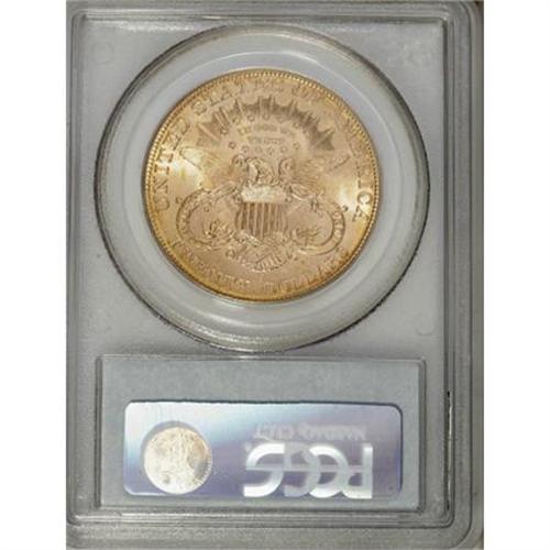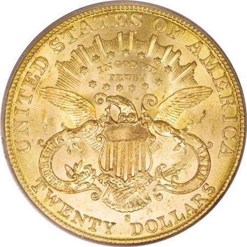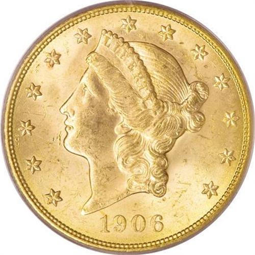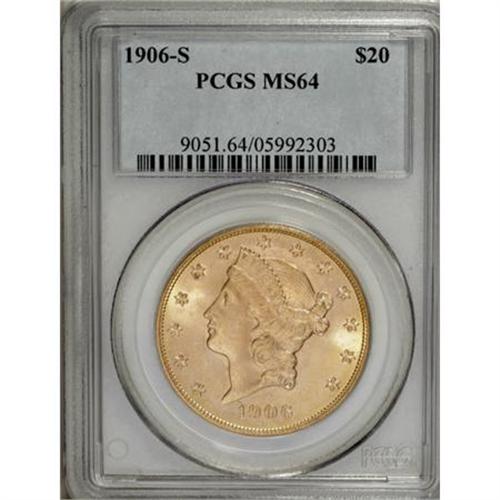 <B>1906-S $20 MS64 PCGS.</B></I> Well struck with intense mint luster and lovely honey-gold and rose coloration. Both sides display a few minor, well-scattered abrasions. This is a scarce issue at the Choice Mint State level of preservation, and the combined efforts of PCGS and NGC have certified only seven pieces finer (3/08).<BR><BR><B>Coin Engraver:</B> James B. Longacre<BR><BR><b>Shipping:</b> Coins & Currency (<a target="_blank" href="http://www.heritageauctions.com/common/shipping.php">view shipping information</a>)