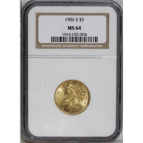 <B>1906-S<$5> MS64 NGC.</B></I> This is an impressive example with few peers and even fewer pieces that carry a higher grade. Faint traces of pinkish toning are evident over highly lustrous yellow-gold surfaces. Census: 19 in 64, 12 finer (8/06).