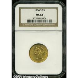 <B>1906-S<$5> MS64 NGC.</B></I> Warm reddish-gold color overlays lustrous, overall smooth looking surfaces. An important Choice quality representative of this late date S-mint condition rarity. <BR><BR><B>Important notice:</B> Heritage usually auctions material at the rate of 200-250 lots per hour. On some occasions eBay Live bid software or the Internet may not be able to keep up with the pace of the auction. We recommend placing a realistic absentee bid now as insurance to avoid disappointment. Occasionally the auctioneer may eliminate or reject an eBay Live bid, and the auctioneer may also reopen a lot after the close of the eBay live bidding (usually because we missed an audience bid), and may reject your bid even if it shows you as the winning bidder. By bidding via eBay Live, you agree that Heritage may award the lot to another bidder at its sole discretion under the circumstances described above or any other reasonable circumstances. Since eBay bids are not shown to us until we open the lot on the floor, we treat those bids just like floor bids. In most cases the floor responds before the eBay bid is presented to us, due to Internet lag time, so for consistency we have made it a policy that floor bids are always considered first over tie eBay live bids. Also please note that all Heritage lots purchased through eBay Live carry a 20% Buyer's Premium. Please make sure you read the Terms and Conditions before you bid.