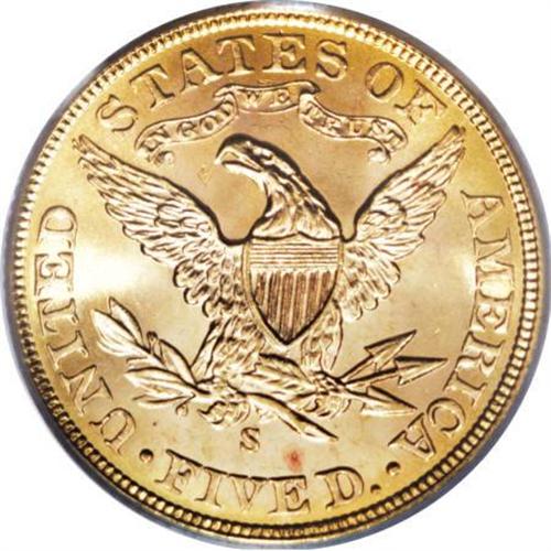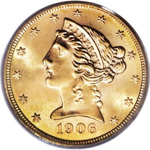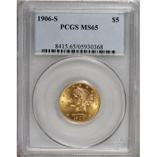<B>1906-S $5 MS65 PCGS.</B></I> Jeff Garrett and Ron Guth (2006) write that: "Although the 1906-S half eagle is not rare in most grades, it is certainly underpriced in the higher states of preservation." The Gem that we offer in this lot displays potent luster and vibrant peach-gold color, and a sharp strike brings out strong definition on the design elements. Some minute marks are noted on the cheek and neck and in the left obverse field. Population: 9 in 65, 5 finer (5/07).<BR><BR><b>Shipping:</b> Coins & Currency (<a target="_blank" href="http://www.heritageauctions.com/common/shipping.php">view shipping information</a>)