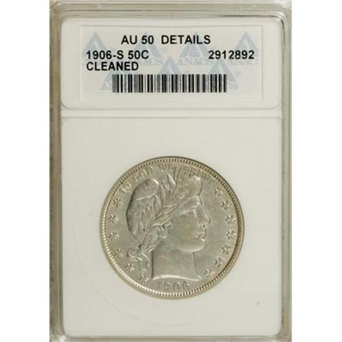 <B>1906-S 50C --Cleaned--ANACS. AU50 Details.</B></I> NGC Census: (3/75). PCGS Population (5/104). Mintage: 1,740,154. Numismedia Wsl. Price for NGC/PCGS coin in AU50: $242. (#6507)<BR><BR><B>Coin Engraver:</B> Charles E. Barber<BR><BR><b>Shipping:</b> Coins & Currency (<a target="_blank" href="http://www.heritageauctions.com/common/shipping.php">view shipping information</a>\)
