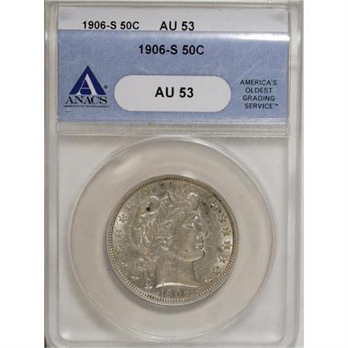 <B>1906-S 50C AU53 ANACS.</B></I> . NGC Census: (3/74). PCGS Population (1/105). Mintage: 1,740,154. Numismedia Wsl. Price for NGC/PCGS coin in AU53: $250. (#6507)<BR><BR><B>Coin Engraver:</B> Charles E. Barber<BR><BR><b>Shipping:</b> Coins & Currency (<a target="_blank" href="http://www.heritageauctions.com/common/shipping.php">view shipping information</a>)