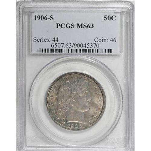 <B>1906-S 50C MS63 PCGS.</B></I> Delicate blue-green, gold, and silver-gray shadings enrich the satiny surfaces of this attractive S-mint half. Pleasing for the grade with only a handful of wispy abrasions. Population: 25 in 63, 47 finer (2/08).<BR><BR><B>Coin Engraver:</B> Charles E. Barber<BR><BR><b>Shipping:</b> Coins & Currency (<a target="_blank" href="http://www.heritageauctions.com/common/shipping.php">view shipping information</a>)