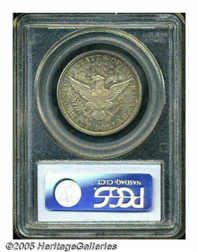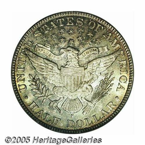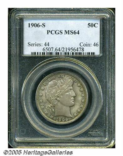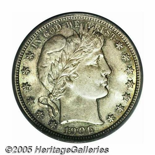 <B>1906-S<50C> MS64 PCGS.</B></I> Many of the Barber Half Dollars are surprisingly difficult to locate in Choice or Gem Mint State, and this issue is no exception. Although nearly 2 million examples were coined, most survivors are circulated, or low-level Mint State at the best. This is a delightful example with frosty luster beneath golden-brown color, ringed by iridescent toning along the borders. Population: 29 in 64, 15 finer (5/05).