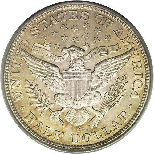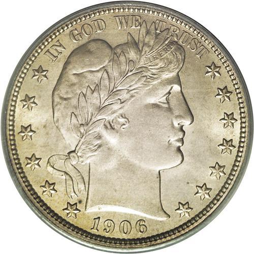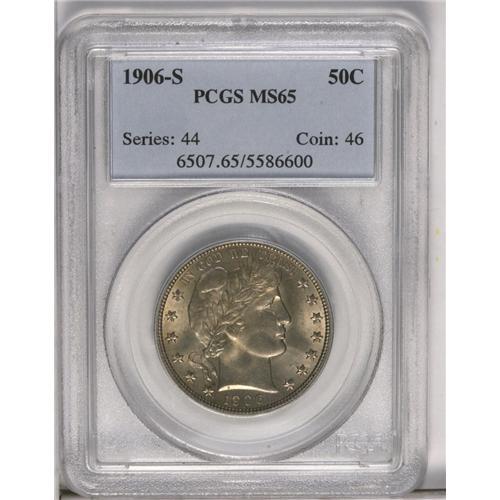 <B>1906-S<50C> MS65 PCGS.</B></I> Few Barber half dollars are seen with surfaces as smooth as those on each side of this vibrantly lustrous Gem. Variegated golden-orange and olive-gray toning are found on the reverse, while the obverse displays even tan-gray color. The striking details are nearly full on all of the design details, save only for the eagle's right (facing) talons and arrow fletchings. This issue's original mintage of 1.7 million pieces is not among the lowest in the Barber half dollar series. Still, the 1906-S is a conditionally challenging issue that is difficult to locate in Mint State. Population: 10 in 65, 5 finer (6/06).