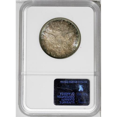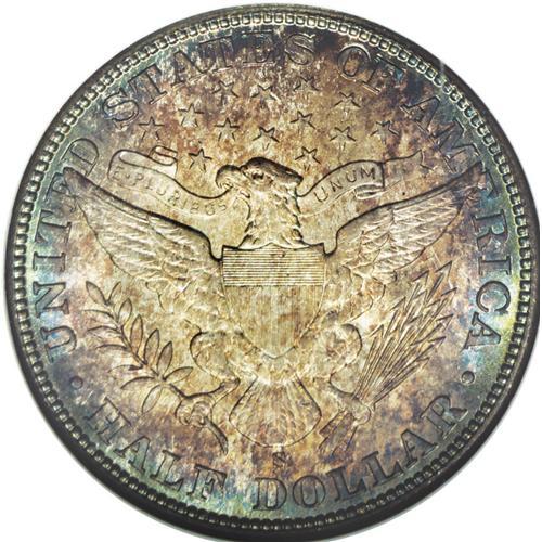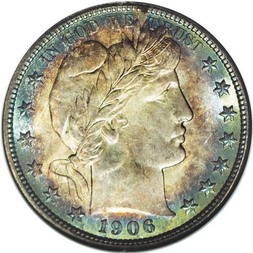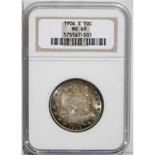 <B>1906-S<50C> MS69 NGC.</B></I> To state that this is the finest 1906-S half only tells part of the story of this coin. It is, in fact, the finest business strike Barber half certified by both of the major grading services according to their July, 2006 data. As such, this piece is doubly important since anyone who is assembling a Finest Known Set of Barber halves or anyone who is acquiring the finest known of 20th century type will need to acquire this coin.<BR> This is an outstanding type coin that would equally grace the highest quality collection of Barber coinage. As one would expect, the mint luster is frosted and rolls over each side unimpeded by the usual impairments seen on these larger-sized silver coins. Formidable eye appeal is created by the gorgeous colors that grace each side, which also brings up the subject of originality, a characteristic that is unquestioned on this piece. Gray-golden toning in the centers is framed by aqua and sea-green at the peripheries. The design elements are boldly struck, with the only softness located on the right (facing) wing where it joins the shield, and on the right (facing) claw. Close examination with a magnifier only shows a couple of tiny marks at the top of the shield, a strike-through (a piece of thread?) at the top of PLURIB(US), and a short, shallow mark below Liberty's eye. Not only the finest business strike Barber half known, this coin also stands as one of the highest quality type coins of all 20th century denominations. A truly outstanding specimen without peers for the type. Population: 1 in 69, 0 finer (7/06).