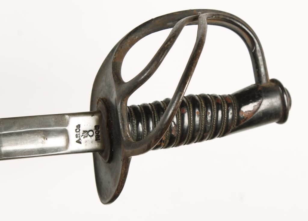 Stamped on ricasso "A.S.Co" above bursting bomb design and "1906". Stamped other side "U.S." and "J.H.O." Iron hand guard and black leather wrapped grip, with wire wrapping as well. Show age with some discoloration on blade, loss to grip wrap, and surface rust to hand guard. Approx 40" overall with 34-3/4" blade. Includes plain scabbard, heavily aged, approx 36-1/4" long.