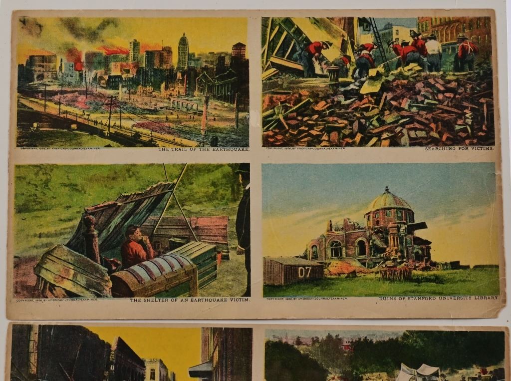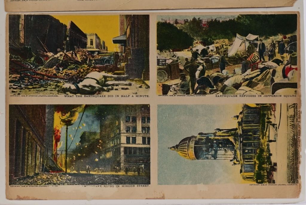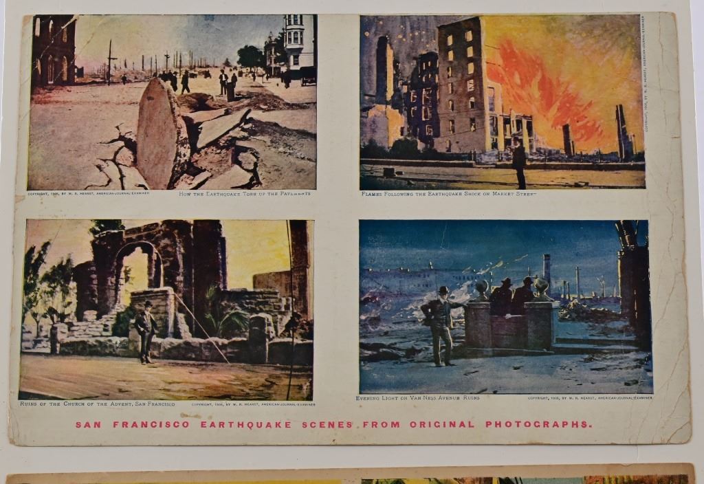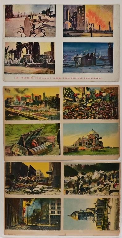 Three (3) post card scenes of San Francisco Earthquake of 1906, as taken from original photographs. Each of the three cards measures 7" x 11"