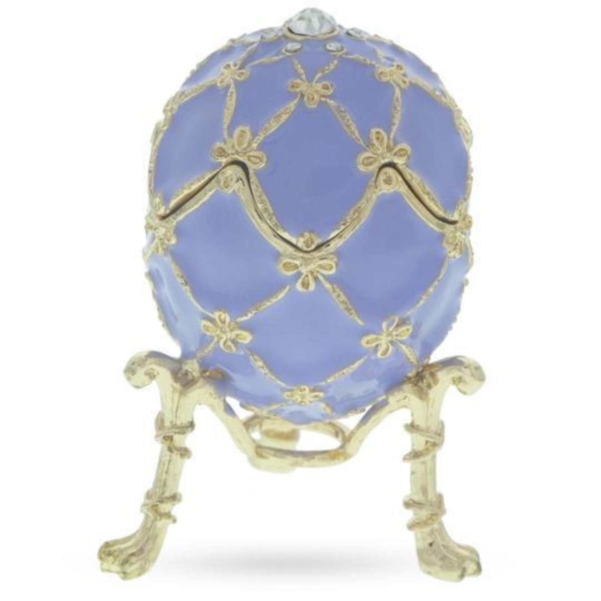 1906 The Swan Royal Russian Egg 2.8 Inches Tall (on a stand) x 1.65 Inches Wide 7.112 cm Tall (on a stand) x 4.191 cm Wide Enameled Gold Plated Pewter Hand Painted Gift Boxed This hand-painted sparkling egg is adorned with a high-polished blue enamel with golden trim. This beauty stands on a golden stand. The egg opens on a hinge and closes shut with a magnet, to keep the box securely shut. The piece comes in a beautiful gift box. Egg History: The egg was created by Carl Peter's workmaster, Henrik Winstrom and is crafted of gold, green and pink enamel in various shades, portrait diamonds, rose-cut diamonds, and satin lining. This egg is enameled in translucent pale green and latticed with rose-cut diamonds and decorated with opaque light and dark pink enamel roses and emerald green leaves. Â