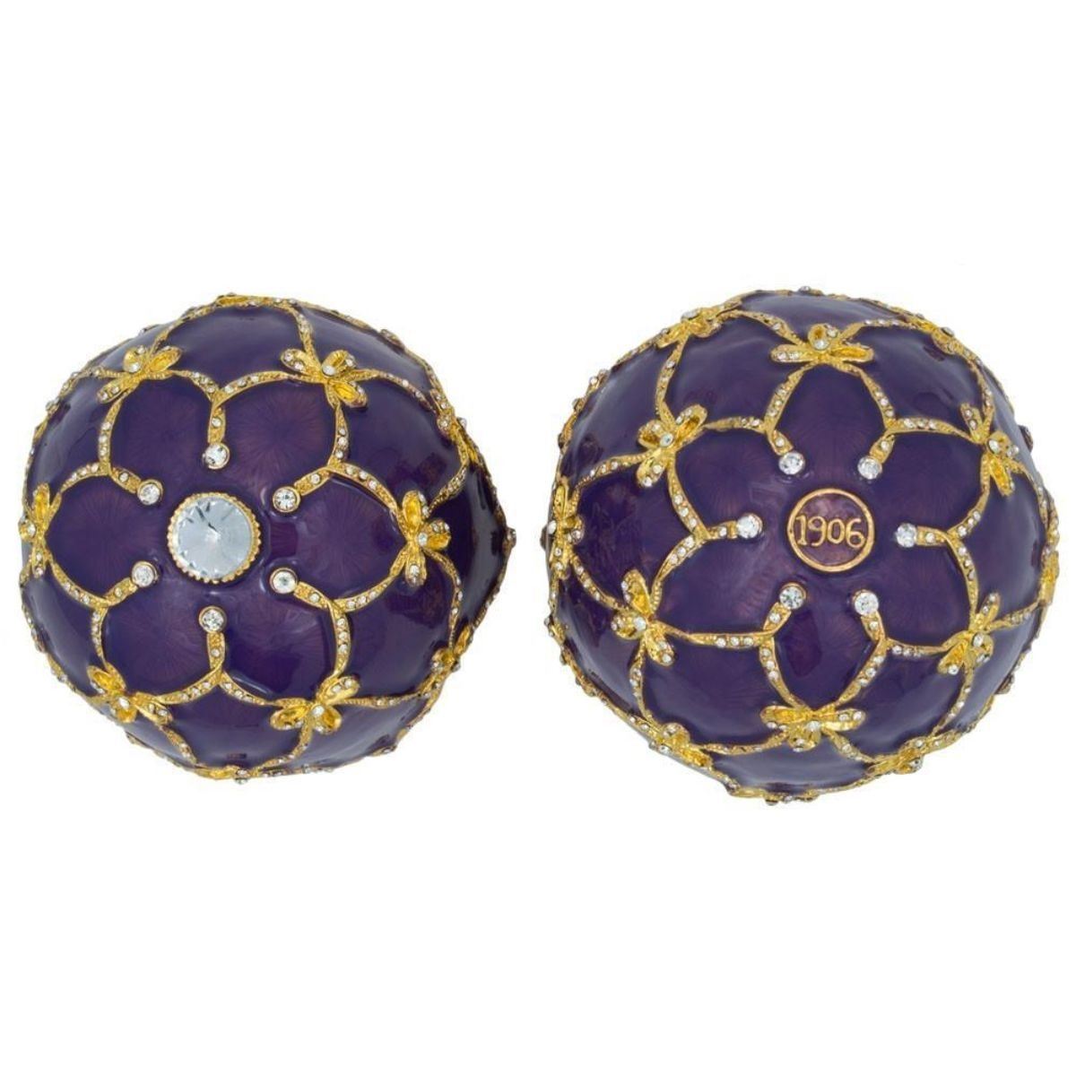 1906 The Swan Royal Russian Egg  6 Inches Tall (Egg on a Stand) 4 Inches Tall (Just the Egg) 3 Inches Diameter Pewter, Enamel, Crystals Hand Crafted Padded Satin Lined Gift Box Egg History: The Swan Egg was ordered in 1906 by Tsar Nicholas II, and the egg was presented to the Dowager Empress Maria Feodorovna on Easter that year for her 40th wedding anniversary. It was made of mauve enamel, with gold trim. On the exterior is a twisted ribbon trellis design of rose-cut diamonds, as well as a portrait diamond on the top inscribed "1906". Another portrait diamond on the other end once held the Imperial monograph. The "surprise" that came inside the egg is a miniature gold and silver swan on a "lake" of aquamarine. By winding a gear beneath one of the wings, the bird's mechanical neck and wings move. In Russia, the swan is considered a symbol of family life and the permanence of the bond of marriage. View photos For Further Details