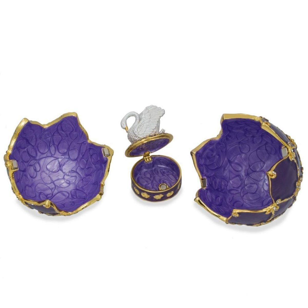 1906 The Swan Royal Russian Egg  6 Inches Tall (Egg on a Stand) 4 Inches Tall (Just the Egg) 3 Inches Diameter Pewter, Enamel, Crystals Hand Crafted Padded Satin Lined Gift Box Egg History: The Swan Egg was ordered in 1906 by Tsar Nicholas II, and the egg was presented to the Dowager Empress Maria Feodorovna on Easter that year for her 40th wedding anniversary. It was made of mauve enamel, with gold trim. On the exterior is a twisted ribbon trellis design of rose-cut diamonds, as well as a portrait diamond on the top inscribed "1906". Another portrait diamond on the other end once held the Imperial monograph. The "surprise" that came inside the egg is a miniature gold and silver swan on a "lake" of aquamarine. By winding a gear beneath one of the wings, the bird's mechanical neck and wings move. In Russia, the swan is considered a symbol of family life and the permanence of the bond of marriage. View photos For Further Details