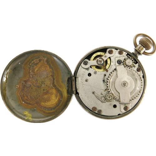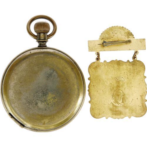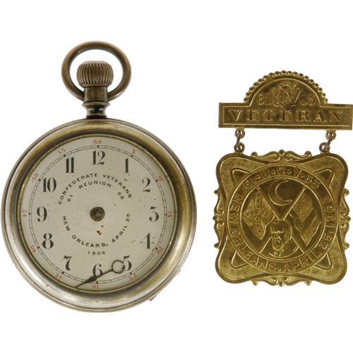 <B>1906 U.C.V. New Orleans Reunion Watch and Medal.</B></I> One hundred years ago, in 1906, the Crescent City was host to a United Confederate Veterans Reunion and some attendee came home with these great souvenir items. The first is a pocket watch 2.25" in diameter with "Confederate Veterans 61 Reunion 65" and "New Orleans, April 25, 1906" on the dial. The movement was made by Western Clock Mfg. Co. of LaSalle, Illinois. The watch has seen some use and is not running. In fact the minute hand is missing and the hour hand is loose but these problems can be fixed with a visit to a good watchmaker. Watches from these reunions are not at all common. Also in this lot is a gold tone medal reading "61 U.C.V. 65 New Orleans. April 25, 1906" hanging from a badge that proudly proclaims "61 UCV 65 Veteran" with an overall size of 1.5" x 2.375". The images are of a crescent, two Confederate flags, and Robert E. Lee. This medal and badge is in excellent condition.