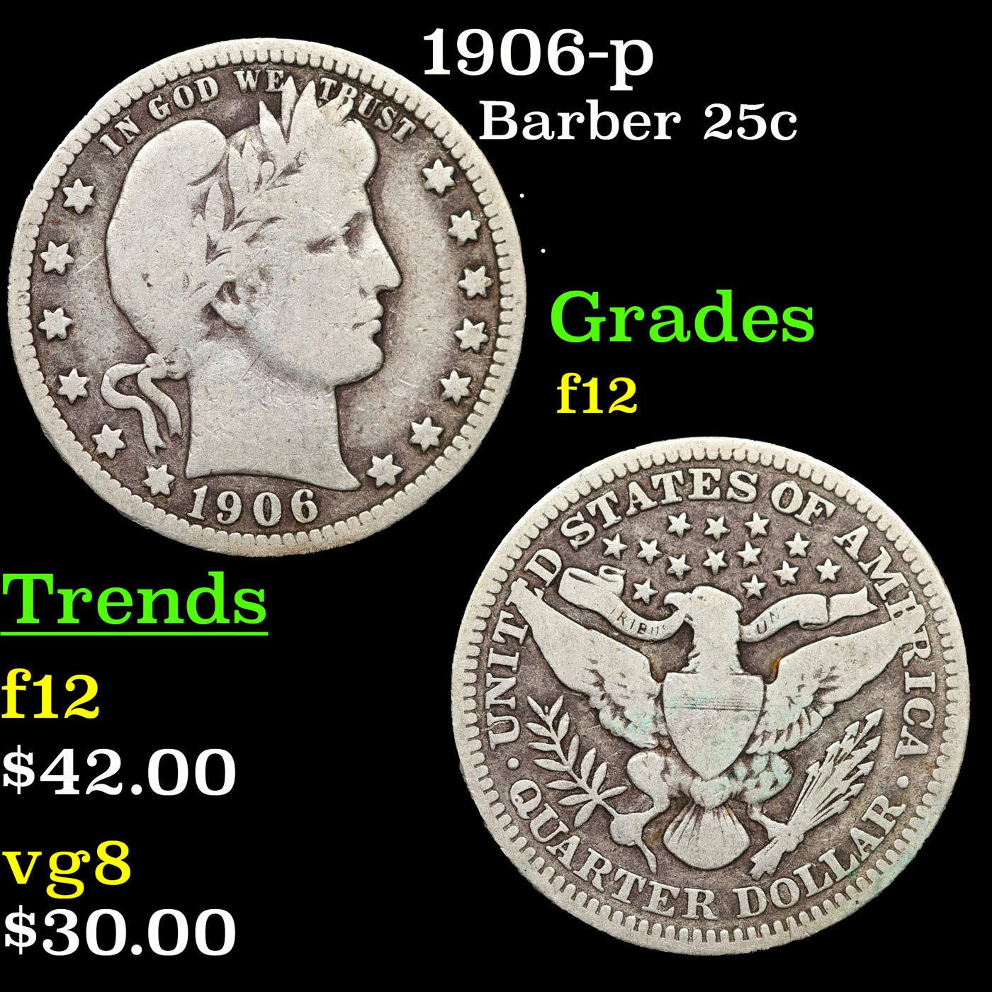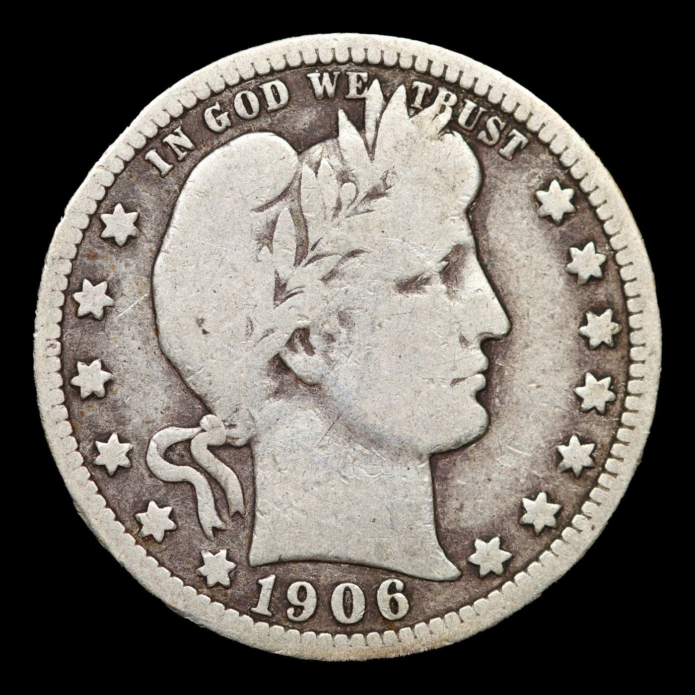 1906-p Barber Quarter 25c Grades f, fine.