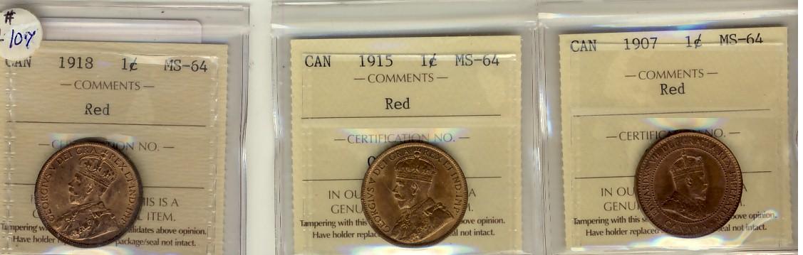 1907 1¢, 1915 & 1918 ICCS MS64RD. Lot of 3 coins.