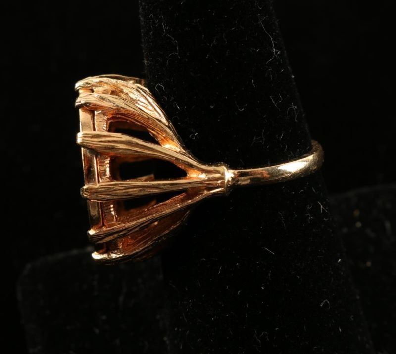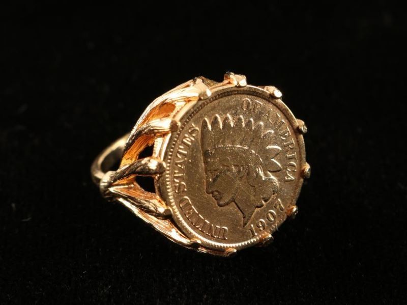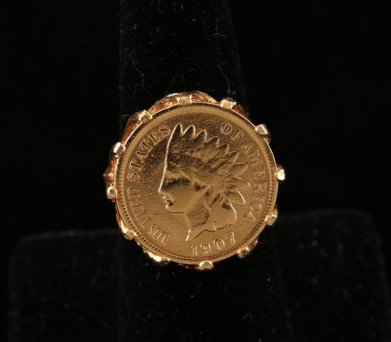 Coin is marked 'United States of America 1907' with profile of Native American with headdress in the center. Held in place by branches of gold coming up from ring base. Marked '18K'.