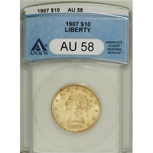 <B>1907 $10 AU58 ANACS.</B></I> NGC Census: (227/16201). PCGS Population (404/11891). Mintage: 1,203,973. Numismedia Wsl. Price for NGC/PCGS coin in AU58: $346. (#8763)<BR><BR><B>Coin Engraver:</B> Christian Gobrecht<BR><BR><b>Shipping:</b> Coins & Currency (<a target="_blank" href="http://www.heritageauctions.com/common/shipping.php">view shipping information</a>)