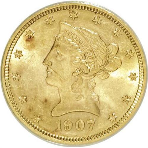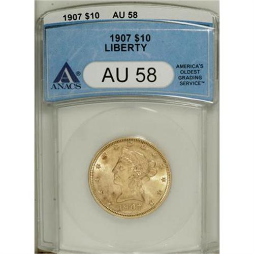 <B>1907 $10 AU58 ANACS.</B></I> NGC Census: (227/16201). PCGS Population (404/11891). Mintage: 1,203,973. Numismedia Wsl. Price for NGC/PCGS coin in AU58: $346. (#8763)<BR><BR><B>Coin Engraver:</B> Christian Gobrecht<BR><BR><b>Shipping:</b> Coins & Currency (<a target="_blank" href="http://www.heritageauctions.com/common/shipping.php">view shipping information</a>)