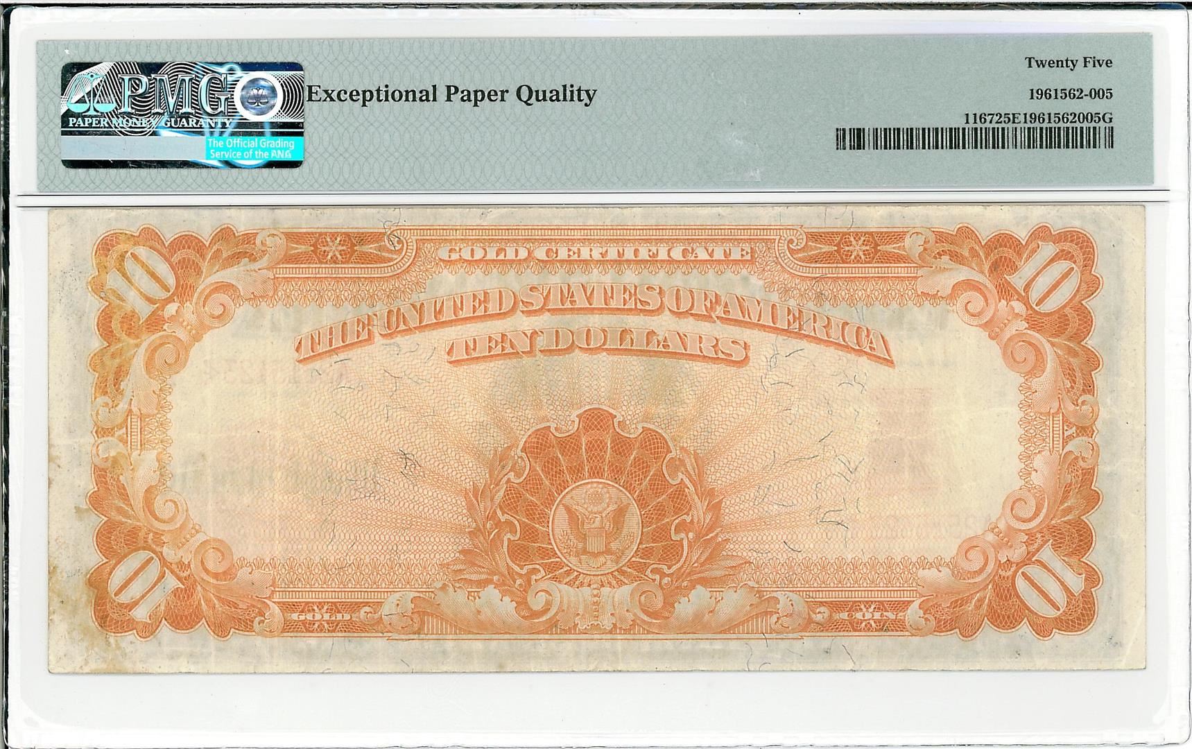 One 1907 $10 Gold Certificate Bank Note PMG 25 Very Fine EPQ. The serial number is 2515423.