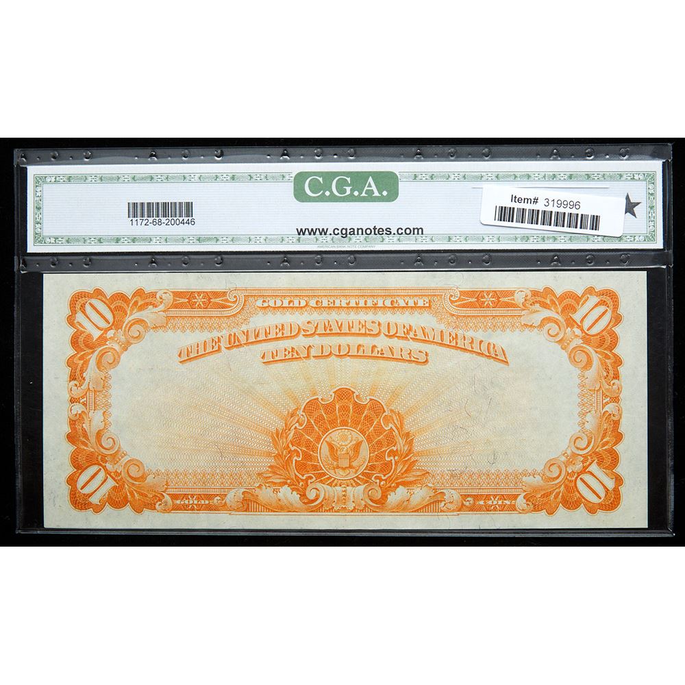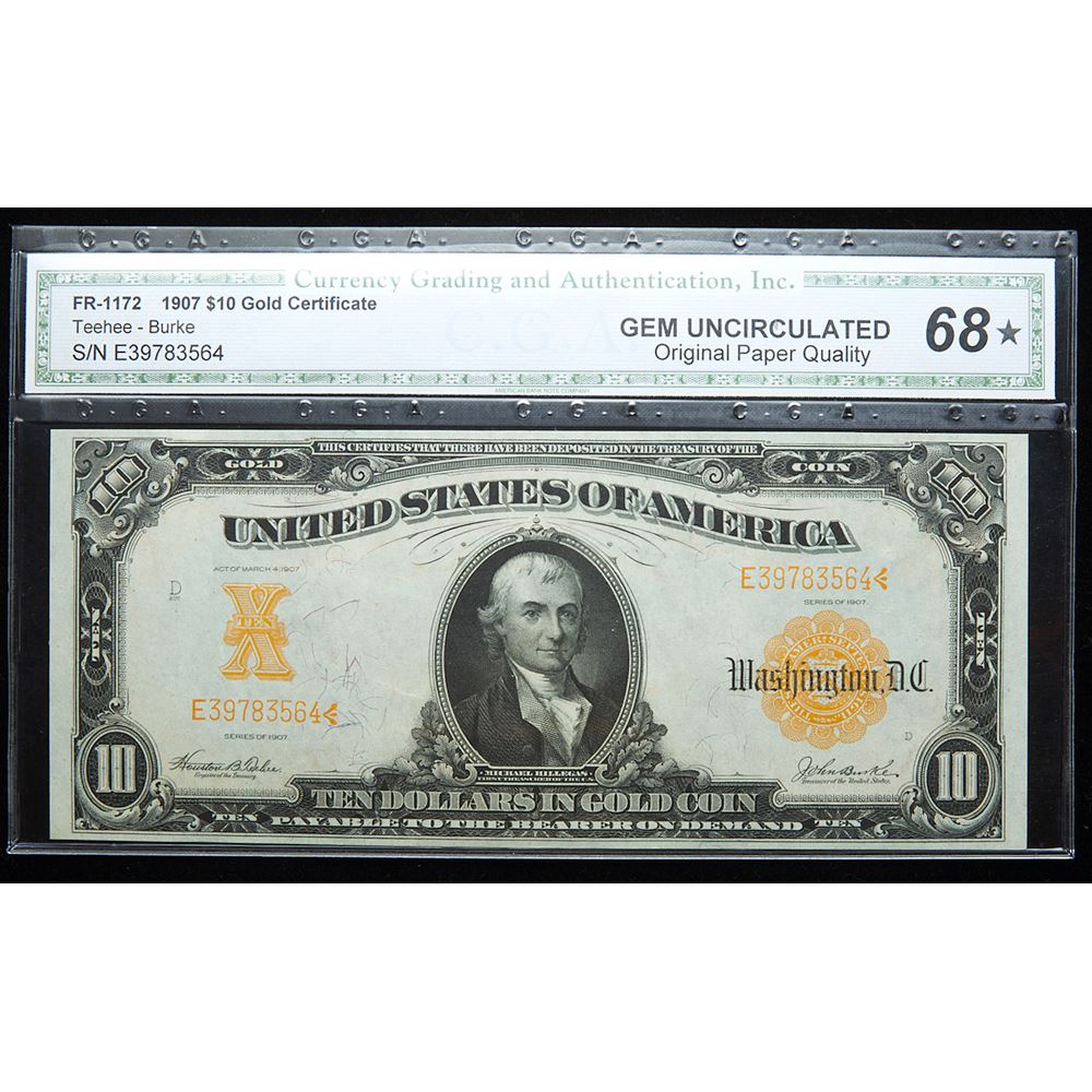1907, 10 Gold Certificate. Fr-1172. KL-441. After reviewing this note we believe it is over graded by CGA. Careful study recommended. CGA graded Gem Uncirculated 68 Star, Original Paper Quality. Estimated Value 2,000 - UP