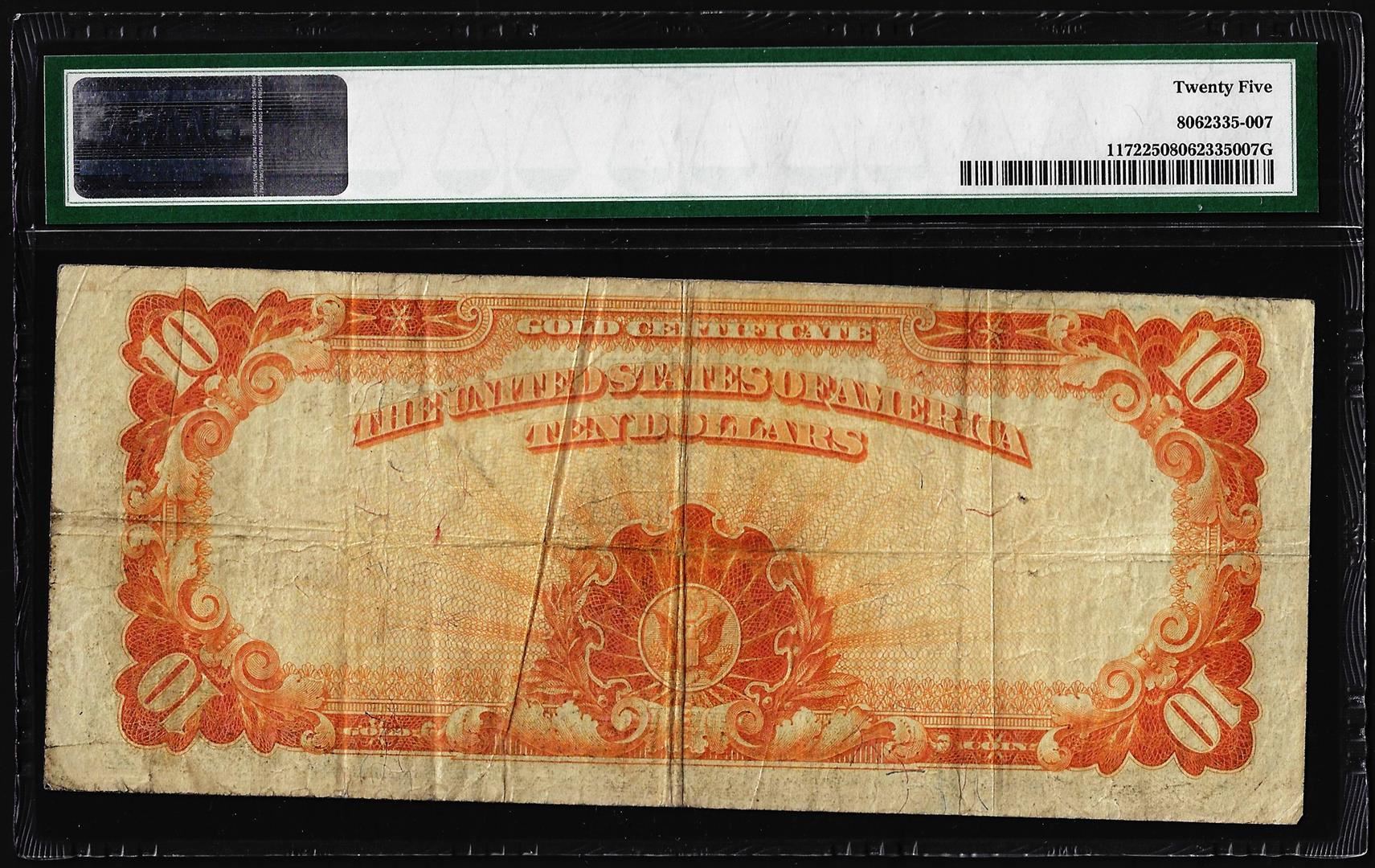 One 1907 $10 Gold Certificate Note Fr.1172 PMG Very Fine 25. PMG Certified.