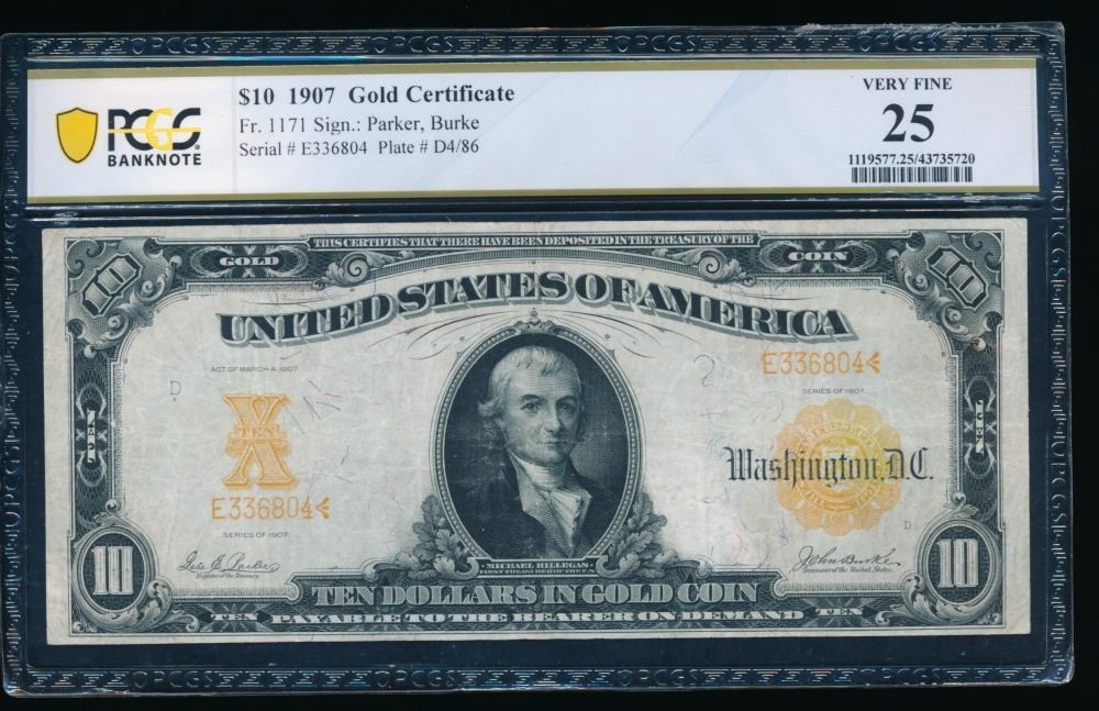 One 1907 $10 Gold Certificate PCGS 25.
