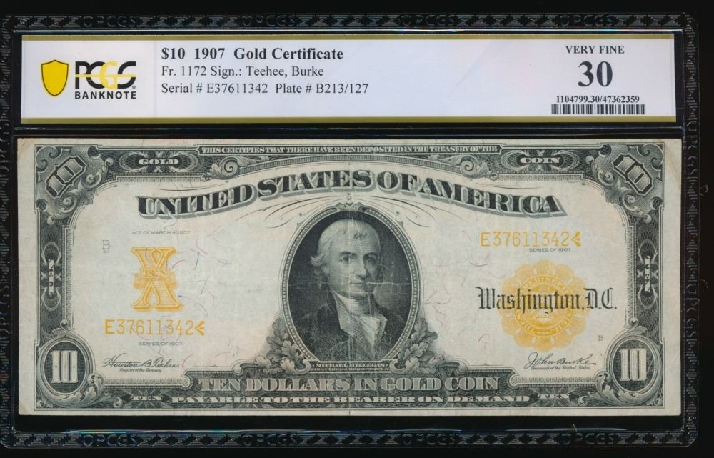 One 1907 $10 Gold Certificate PCGS 30>