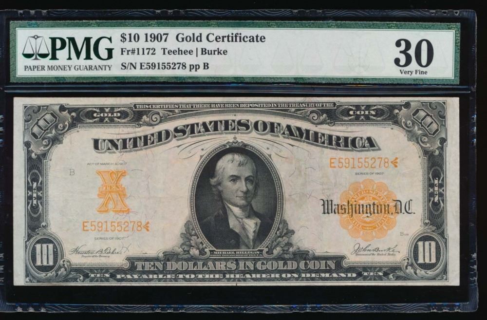 One 1907 $10 Gold Certificate PMG 30 Very Fine.