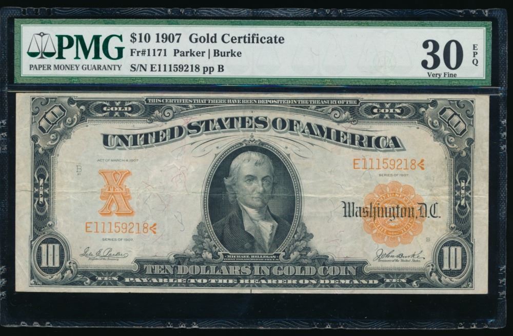 One 1907 $10 Gold Certificate PMG 30EPQ.