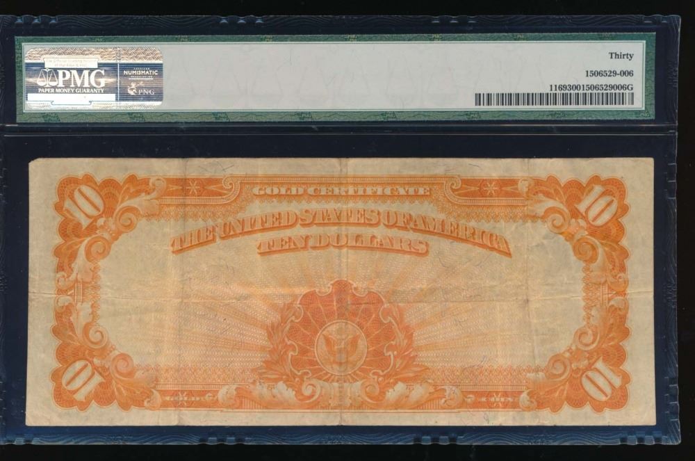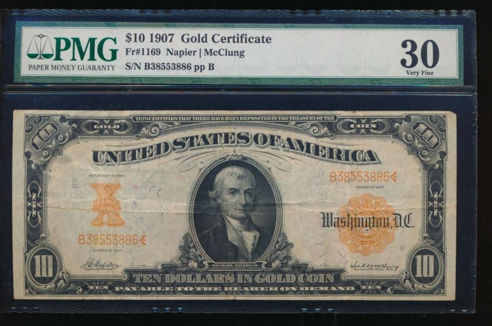 One 1907 $10 Gold Certificate PMG 30.