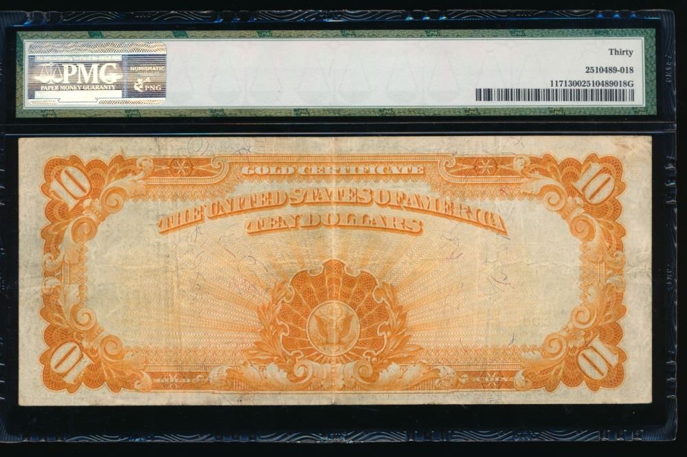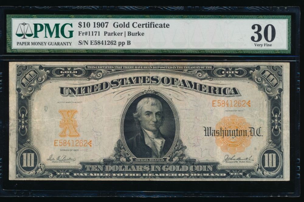 One 1907 $10 Gold Certificate PMG 30.
