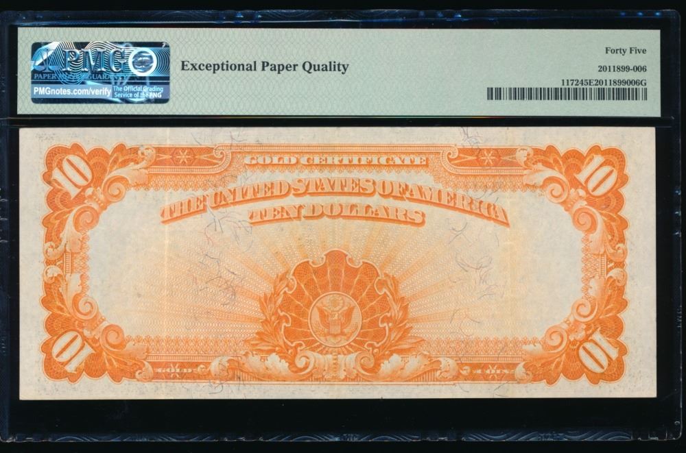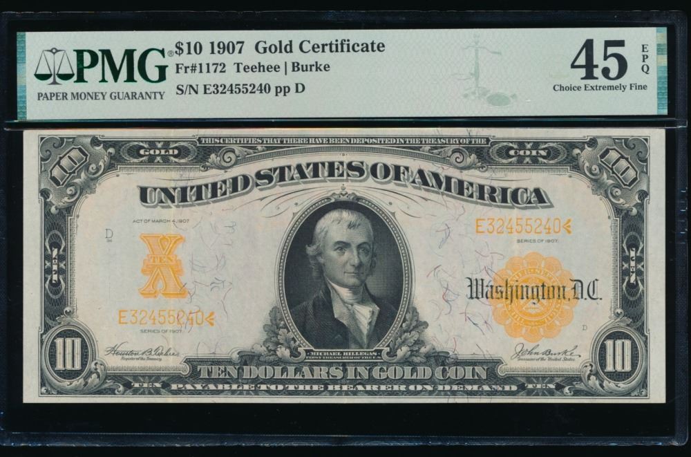 One 1907 $10 Gold Certificate PMG 45EPQ.