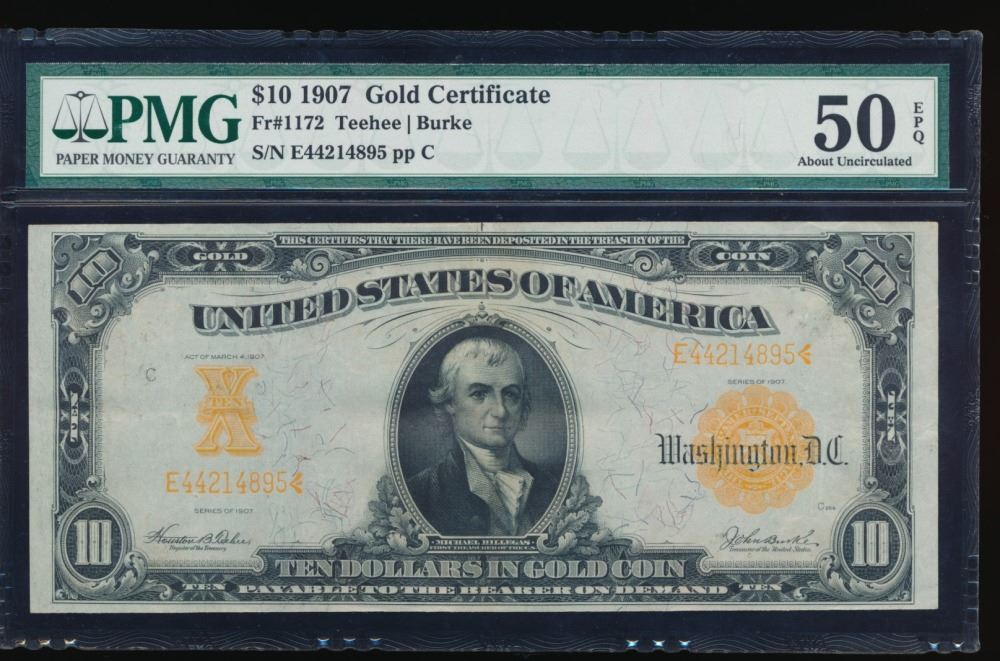 One 1907 $10 Gold Certificate PMG 50EPQ.