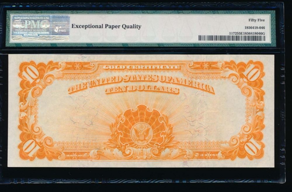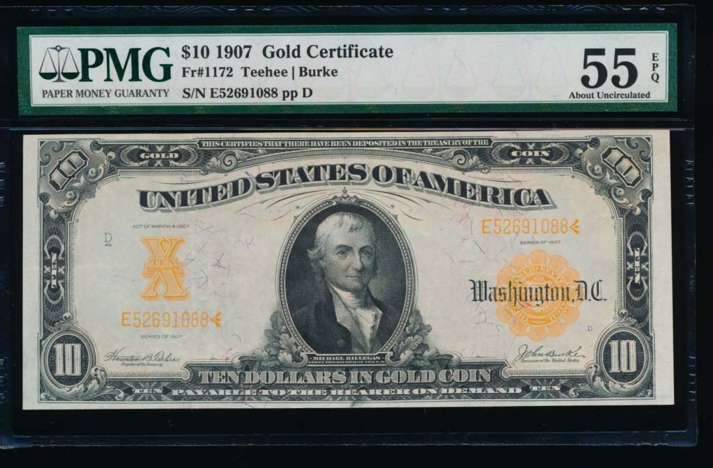 One 1907 $10 Gold Certificate PMG 55EPQ.