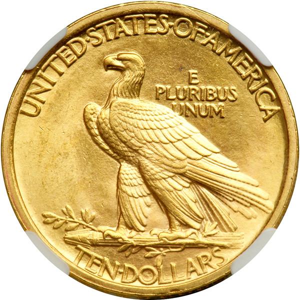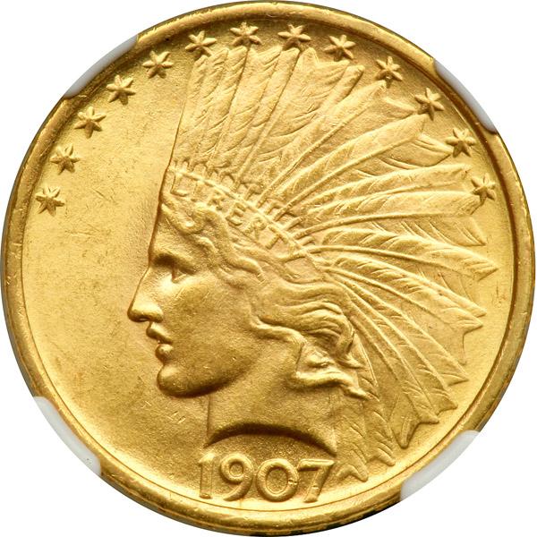 1907 $10 Indian. No periods. NGC graded MS-63 PQ. A lovely satiny choice specimen glittering with mint luster. A Premium Quality example for the grade. The motto IN GOD WE TRUST was purposely absent on the first issues of the new Indian $10 gold, at the request of President Theodore Roosevelt. After negative comments from publicists, Congress restored the motto in later years (1908-33) (PCGS # 8852) .