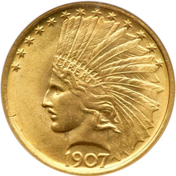1907. No periods. NGC graded MS-64. An untoned beauty. Almost heart-stopping quality. Each side has a beaming reddish-gold originality that surrounds the major devices. Struck with scientific exactness throughout, the 1907 No Motto closely follows the original intent of the artist, Augustus Saint-Gaudens, though with modifications made to the No Motto 1907 and 1908 issues by the Mint staff under the supervision of Chief Engraver Charles E. Barber (PCGS # 8852) .