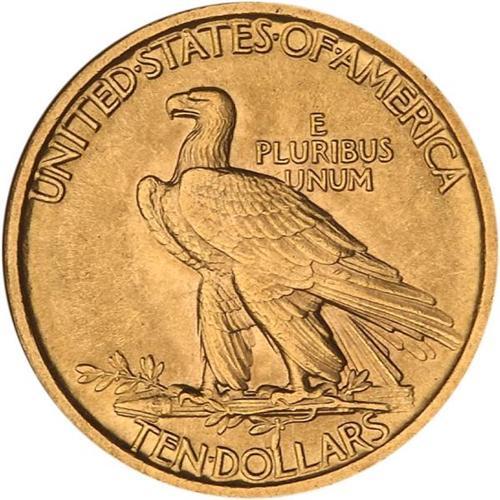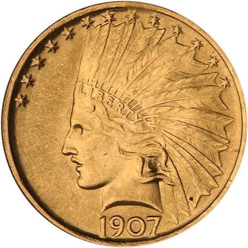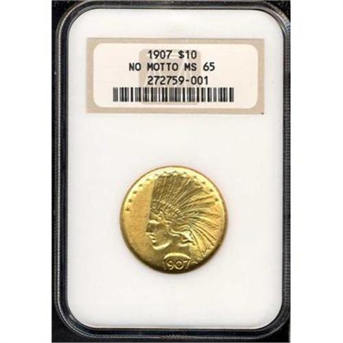 <b>1907 $10 Indian. No periods. NGC graded MS65.</b> NGC Pop: 255. Bright satiny luster and attractive, almost pulsating golden hue from one end to the other. And so to the next qualification, the strike. Here too we see quite good detail with not even minor weakness to the sharp centers, an important aspect that new collectors especially fail to take into account. One of several very beautiful 1907 No Motto Indian tens in the group <b>(PCGS # 8852)</b> <i>