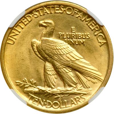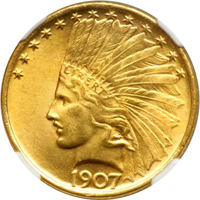 1907 $10 Indian. No periods. Reverse improperly cleaned. This coin looks like a Gem Unc (PCGS # 8852) .