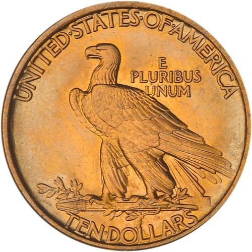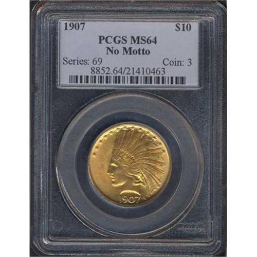 <b>1907 $10 Indian. No periods. PCGS graded MS64.</b> A radiant example in this grade, nicely preserved with gold color that rises and falls in an almost rhythmic display. Since our observation is that this date is rarely fully struck, then this sharp Mint State 64 example has every suggestion of precision manufacture as seen in feathers and hair, and on the reverse, the feathers on the neck, wings, chest, and legs. Only the claws are a little flat appearing <b>(PCGS # 8852)</b>