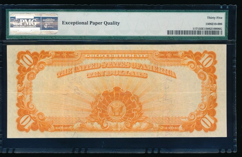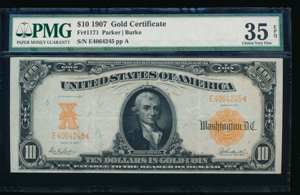 One 1907 $10 Large Gold Certificate PMG 35EPQ.