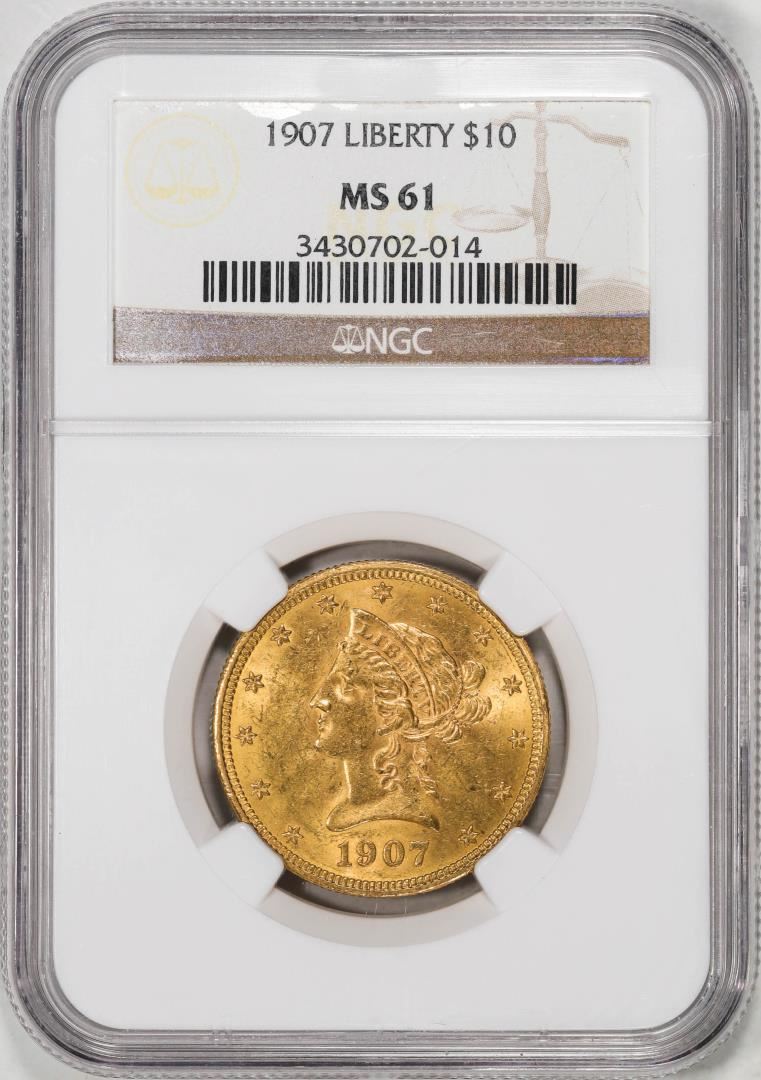 One 1907 $10 Liberty Head Eagle Gold Coin NGC MS61. NGC Certified.
