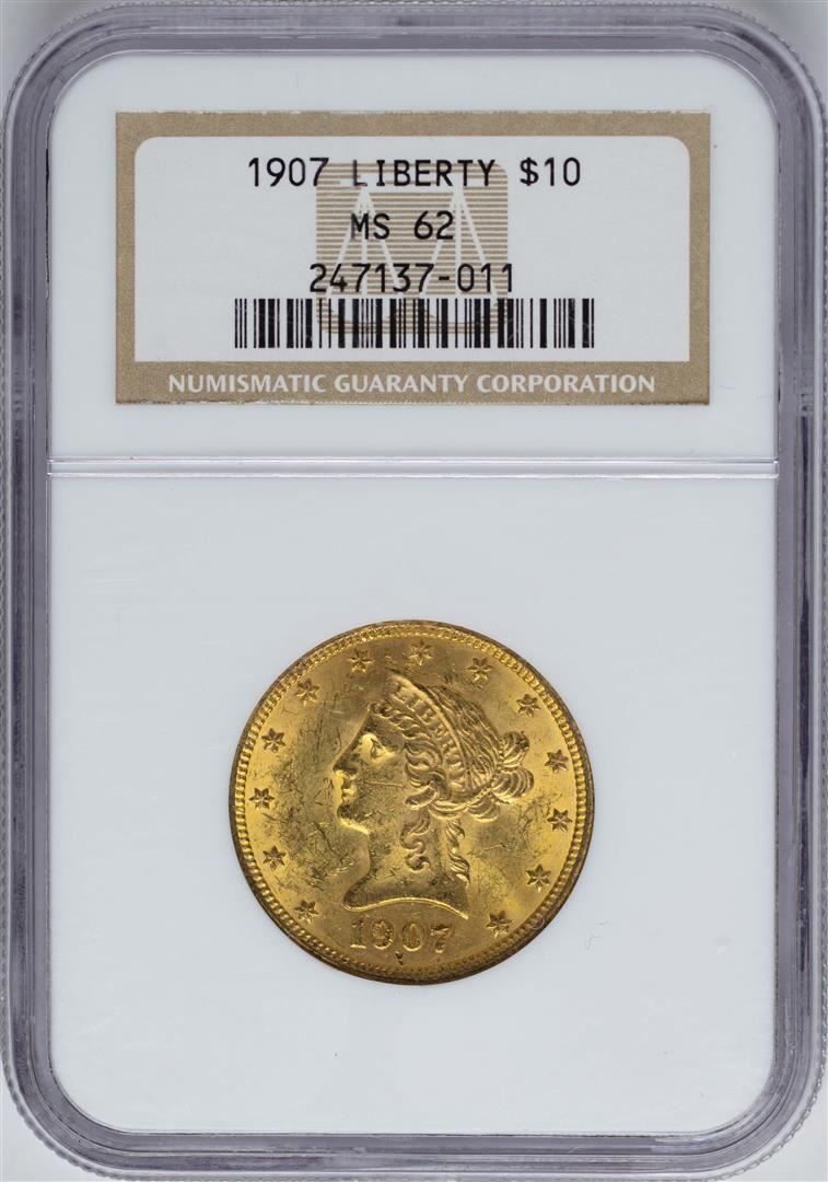 One 1907 $10 Liberty Head Eagle Gold Coin NGC MS62. NGC Certified.