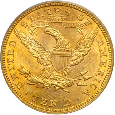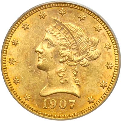 1907 $10 Liberty. PCGS graded MS-62. Both sides exhibit lovely golden orange tones (PCGS # 8763) .