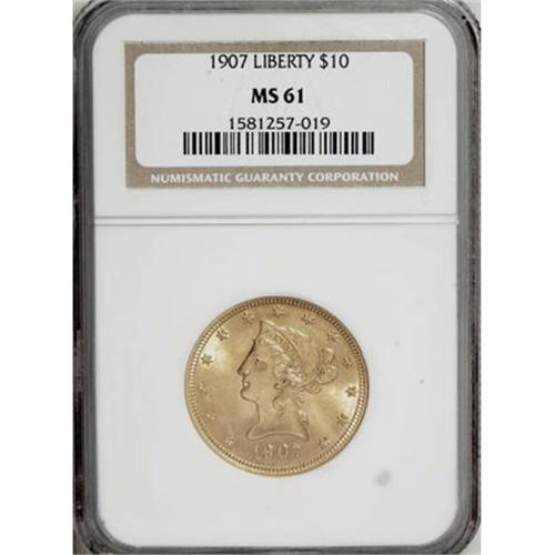 <B>1907 $10 MS61 NGC.</B></I> NGC Census: (3686/12155). PCGS Population (2454/8686). Mintage: 1,203,973. Numismedia Wsl. Price for NGC/PCGS coin in MS61: $379. (#8763)<BR><BR><B>Coin Engraver:</B> Christian Gobrecht<BR><BR><b>Shipping:</b> Coins & Currency (<a target="_blank" href="http://www.heritageauctions.com/common/shipping.php">view shipping information</a>)