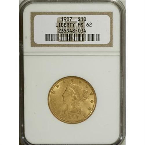 <B>1907 $10 MS62 NGC.</B></I> NGC Census: (6794/5118). PCGS Population (5480/3084). Mintage: 1,203,973. Numismedia Wsl. Price for NGC/PCGS coin in MS62: $395. (#8763)<BR><BR><B>Coin Engraver:</B> Christian Gobrecht<BR><BR><b>Shipping:</b> Coins & Currency (<a target="_blank" href="http://www.heritageauctions.com/common/shipping.php">view shipping information</a>\)