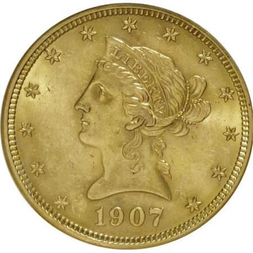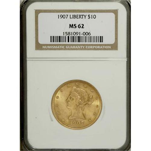 <B>1907 $10 MS62 NGC.</B></I> NGC Census: (6841/5138). PCGS Population (5503/3094). Mintage: 1,203,973. Numismedia Wsl. Price for NGC/PCGS coin in MS62: $395. (#8763)<BR><BR><B>Coin Engraver:</B> Christian Gobrecht<BR><BR><b>Shipping:</b> Coins & Currency (<a target="_blank" href="http://www.heritageauctions.com/common/shipping.php">view shipping information</a>)