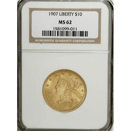 <B>1907 $10 MS62 NGC.</B></I> NGC Census: (6841/5138). PCGS Population (5515/3104). Mintage: 1,203,973. Numismedia Wsl. Price for NGC/PCGS coin in MS62: $395. (#8763)<BR><BR><B>Coin Engraver:</B> Christian Gobrecht<BR><BR><b>Shipping:</b> Coins & Currency (<a target="_blank" href="http://www.heritageauctions.com/common/shipping.php">view shipping information</a>)