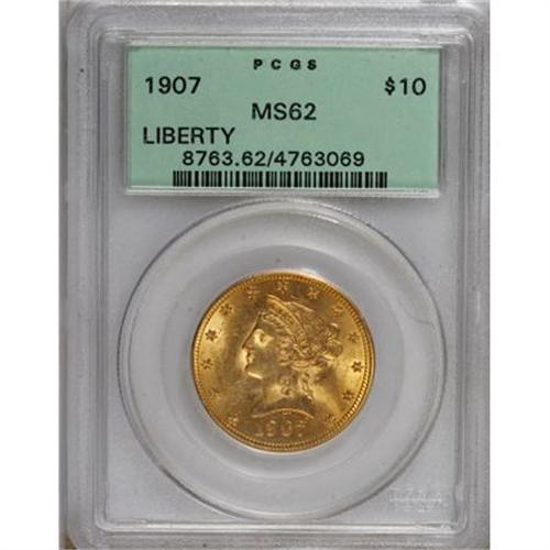 <B>1907 $10 MS62 PCGS.</B></I> PCGS Population (5501/3090). NGC Census: (6841/5138). Mintage: 1,203,973. Numismedia Wsl. Price for NGC/PCGS coin in MS62: $395. (#8763)<BR><BR><B>Coin Engraver:</B> Christian Gobrecht<BR><BR><b>Shipping:</b> Coins & Currency (<a target="_blank" href="http://www.heritageauctions.com/common/shipping.php">view shipping information</a>)
