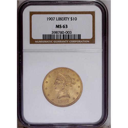 <B>1907 $10 MS63 NGC.</B></I> Apricot and olive tints adorn this satiny and intricately struck example, struck in the year that the long-lived type was replaced by the Indian Eagle. No marks require mention.