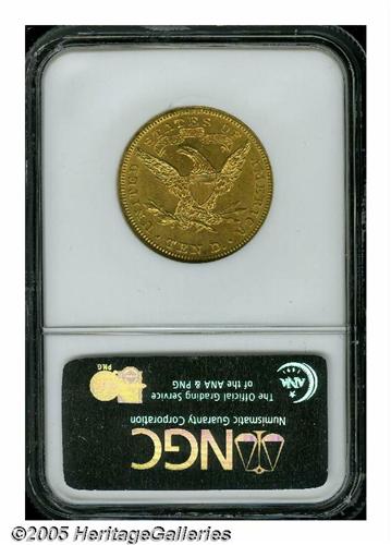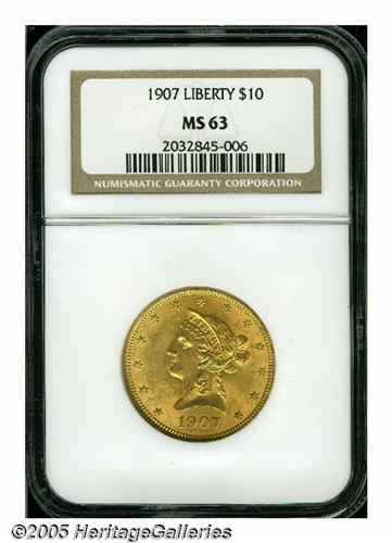 <B>1907<$10> MS63 NGC.</B></I> Flashy surfaces display nice luster and an even brass-gold appearance. Some notable marks are apparent on Liberty's cheek and neck, and a few lighter marks are scattered throughout the fields. The design elements are well impressed, except for weakness in the hair over Liberty's ear.